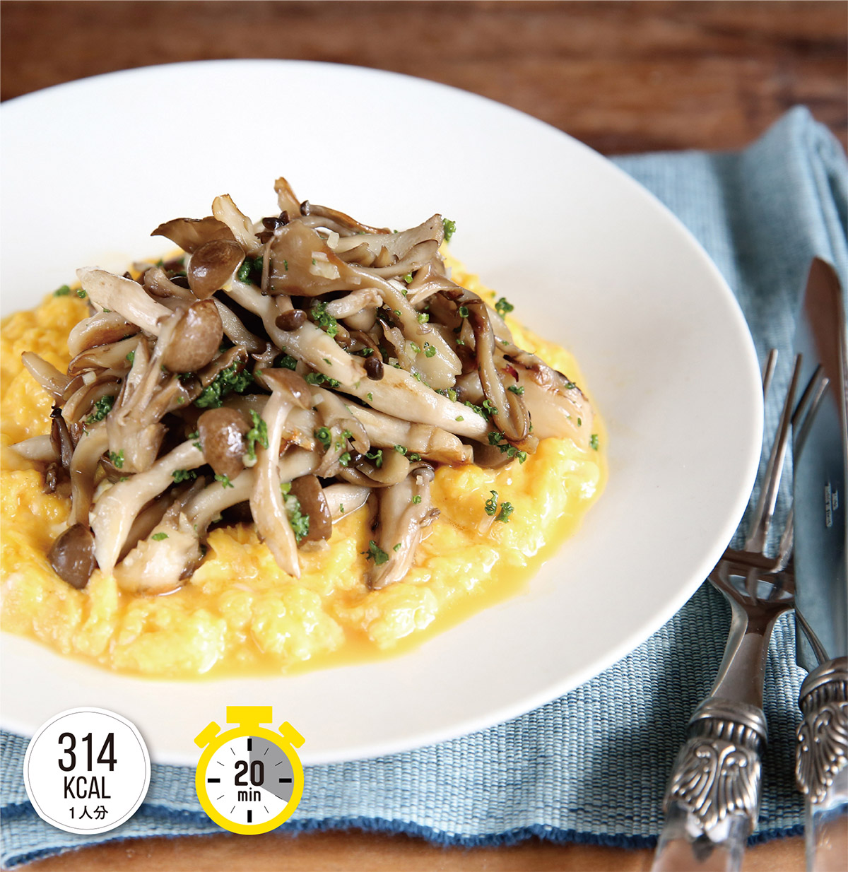 別のフライパンにオリーブオイル大さじ1とバターを熱し、02の卵液を一気に流し入れる。ゴムベラでスクランブル状に混ぜ合わせ、固まってきたら火を止め、形を整えて器に盛り、03の炒めたきのことパセリを盛り付ける。