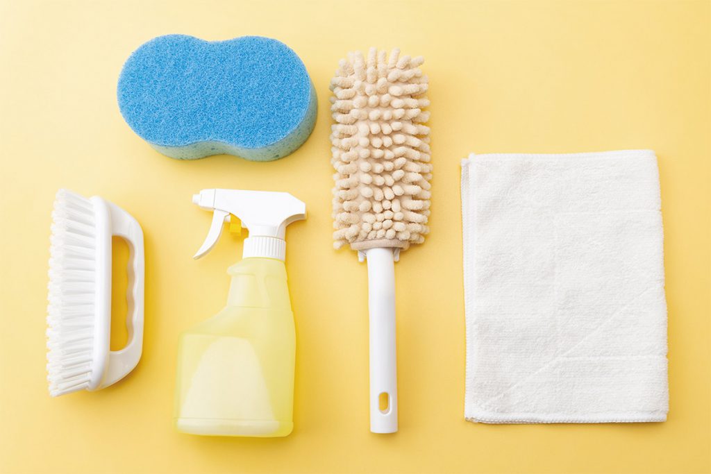 スポンジに洗剤を染み込ませ、それぞれをこすって10〜15分ほど放置する。天井など高い場所には、柄の長いフロアモップの先にマイクロファイバークロスを取り付けて使用するのもオススメ。一気に水で流し、水切りワイパー(スクイージー)やタオルで水分を拭き取る。