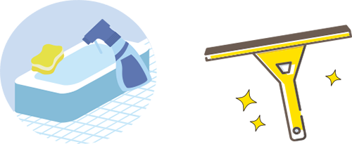 ドアの内側や鏡の水アカは、クエン酸水を吹きかけて拭き取り、しっかり水で洗い流す。ドアのレール部分はホコリを取り除き浴用洗剤を吹きかけ2分ほど放置したら水で流す。