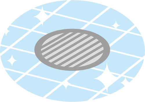 目に見えるゴミを取り除き、目皿とヘアキャッチャーを外す。排水口のパーツを浴用中性洗剤でスポンジやブラシなどでこすり洗いし、水で流す。