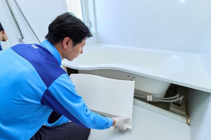 「『浴槽エプロン内清掃』もご依頼が多いオプションです。普段は手が届かない内部まで開けて洗浄し、ぬめりやカビを落とします。無理に外すと破損の恐れもあるので、プロに任せていただくのが安心です」