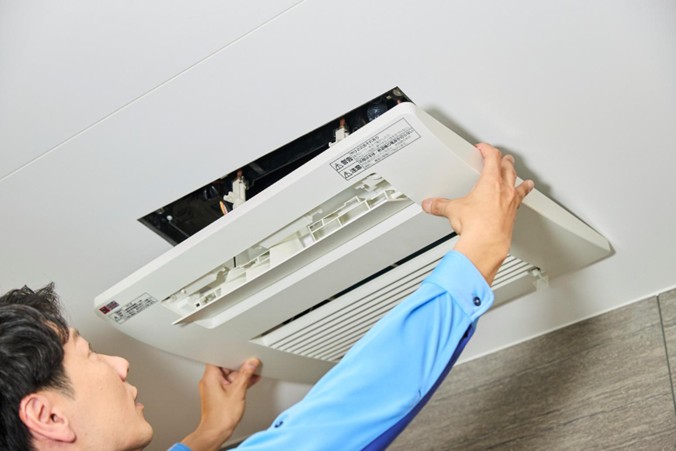 「浴乾は天井に設置されていて、高い位置にあるので手が届きにくく、『どこまで自分で触って良いのか』と不安に感じている方が多い場所です。外側のカバーやフィルター部分はご家庭でも軽く掃除できますが、内部は湿気やホコリがたまりやすく、カビの発生源になりやすい場所です。『浴室暖房乾燥機(換気扇)内部クリーニング』は、ダスキンではエアコン掃除などを担当する事業のスタッフ(サービスマスター)がお伺いして、ファンが取り外し可能なタイプは取り外し、内部のカビやホコリを除去します」
