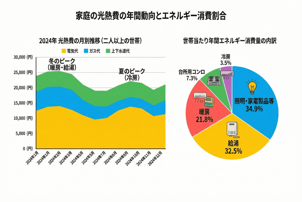 冬場の光熱費は、「暖房」や「給湯」に使われるエネルギーの割合が大きく、家計への影響も大きくなりがちです。年間の家計支出を見ても、光熱費は秋から冬にかけて高くなる傾向があり、特に寒さが厳しくなる時期に支出が増えやすいことが分かっています。そこで暖房と給湯の使い方を見直せば、節約への第一歩となります。