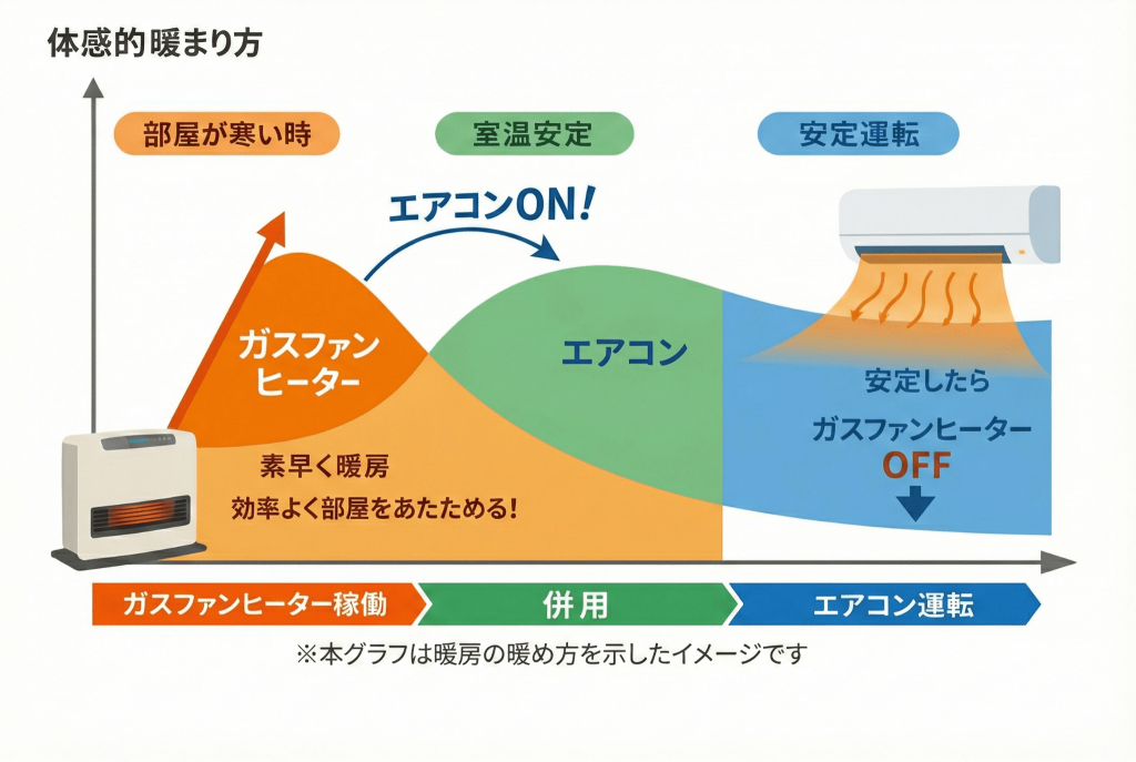 このように、エアコンとガスファンヒーター、それぞれの得意分野を活かして使い分けることで、効率よく部屋を暖めることができ、暖房費の節約につながるのです。