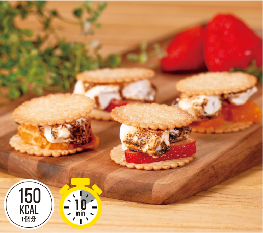 クラッカー1枚の上にお好みの大きさに切ったいちご、オレンジをのせ、その上に01で炙ったマシュマロをのせる。