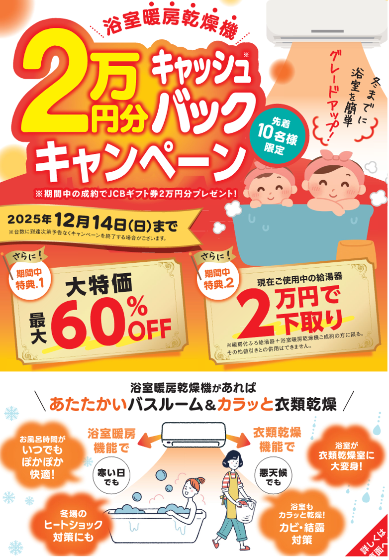 浴室暖房乾燥機キャッシュバックキャンペーン(12/14まで)